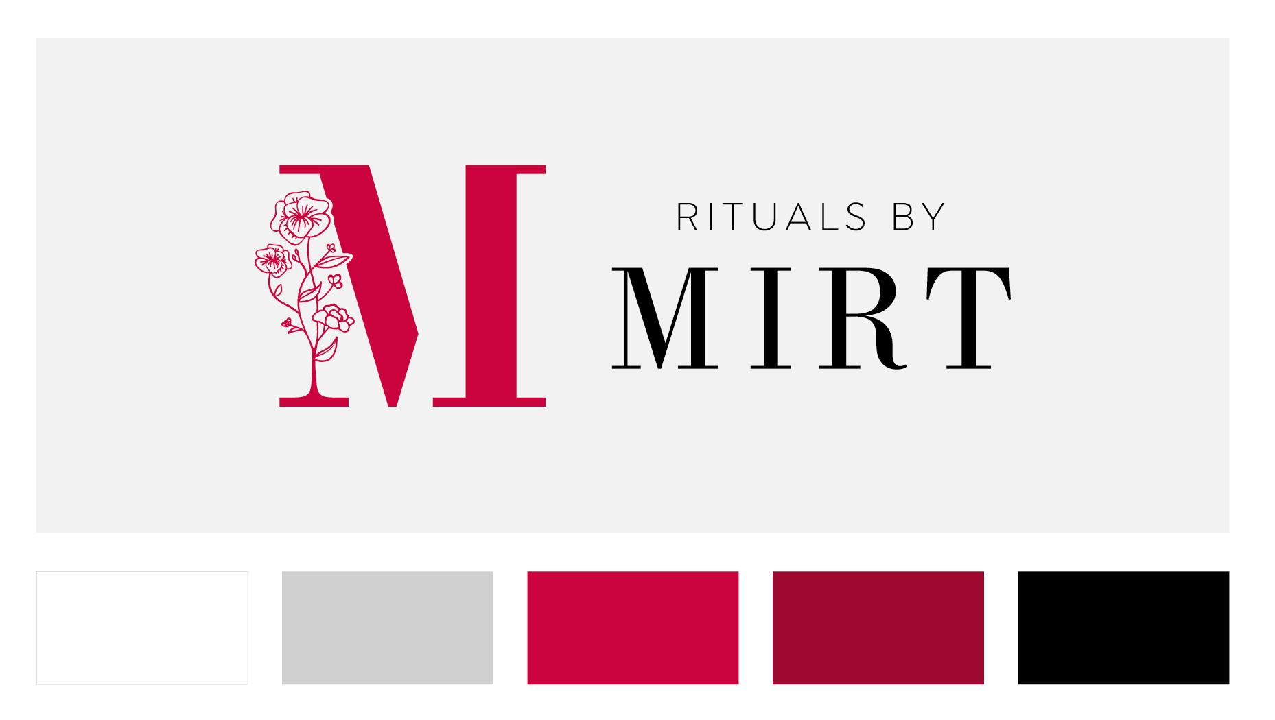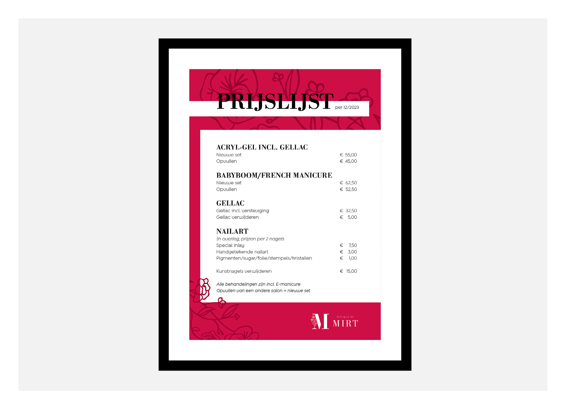De handgetekende bloemen die soms voor een wit blok langs komen zorgen voor een mooi contrast in de strakke huisstijl. Deze breken de moderne basis en zorgen ervoor dat de creativiteit van Mirte ook in haar huisstijl terugkomt.